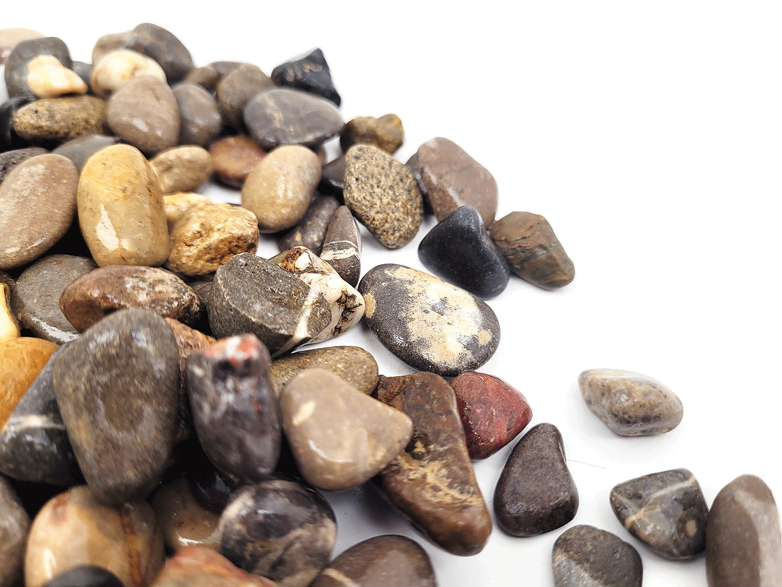 Grindmaat: verkrijgbaar in drie matenmixen (S, Mix en L) variërend van 8-20 mm (S), 8-40 mm (Mix) en 20-40 mm (L). Met deze verscheidenheid aan formaten kunt u een natuurlijker ogende rivierbedding creëren door stenen van verschillende formaten te combineren.